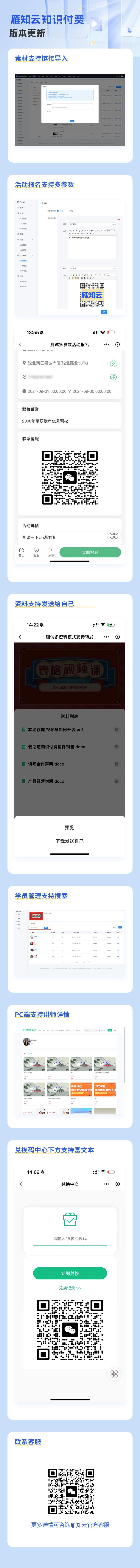 【更新】素材链接导入、活动报名多参数、后台学员管理搜索、资料支持发送给自己、PC支持讲师详情、兑换码