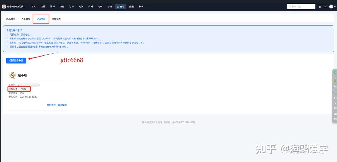 登录雁小知系统后台,找到微信小店插件,输入相关信息,即可完成绑定