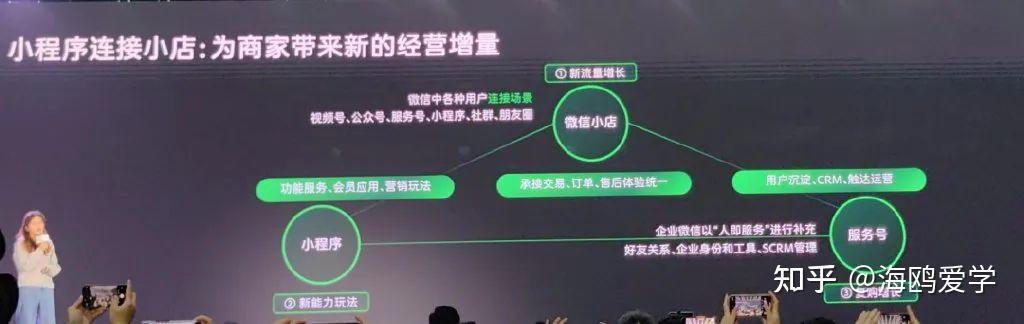 小程序:小程序作为微信生态的一环,可以帮助商家更好展示品牌、管理会员服务、沉淀粉丝,也可以承担售后服务工作,还能跳转微信小店进行成交,满足用户购物需求。