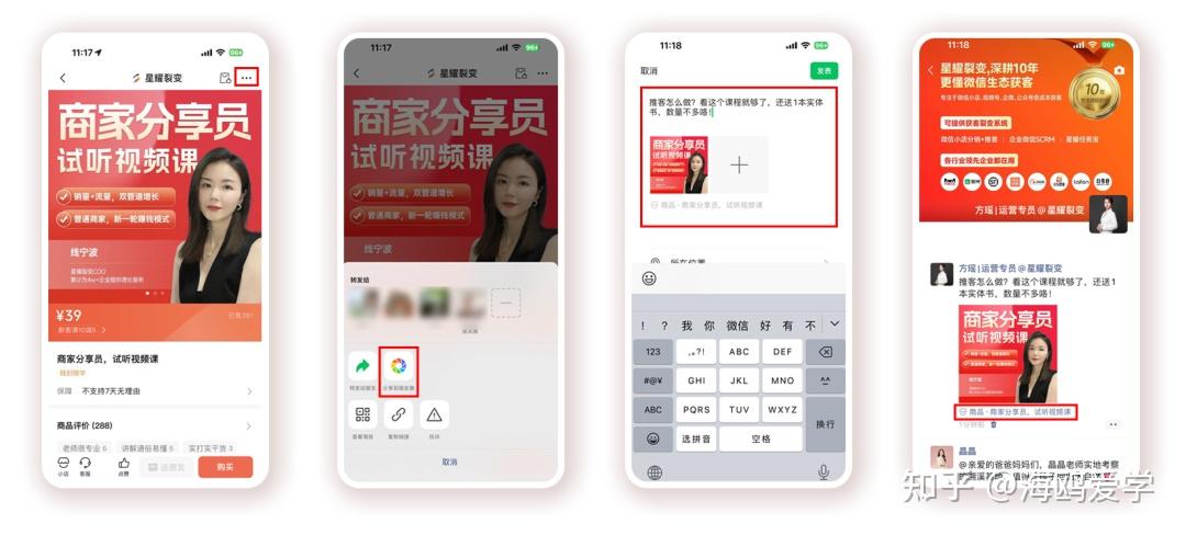 送礼物:用户将微信小店课程,以送礼物的形式发送给好友、社群,结合私域宣传、直播带货、社群推广,让送礼物玩法在微信生态裂变起来,增加曝光和销量。某办公技能老师通过该功能实现单日10万单的爆发。
